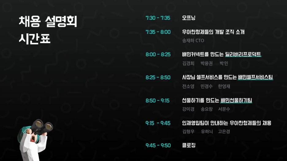 우선 배달의 민족의 핵심역할을 담당하는 딜리버리프로덕트, 배민셀프서비스 팀과 더불어 최근 1년정도 전부터 개설된 선물하기 팀의 설명이 먼저 진행 되었다.