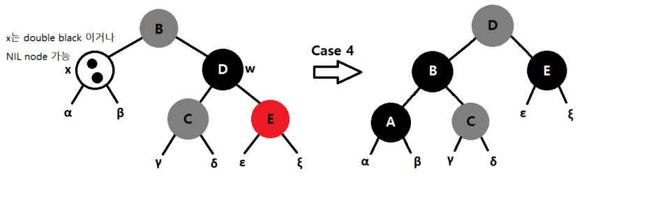 x의 새로운 형제 w는 오른쪽 자식이 red이다. 이는 case4에 해당하는 상황이다.