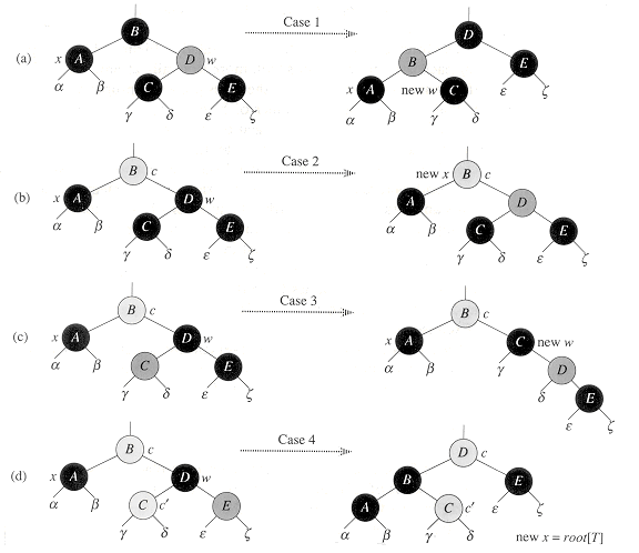 - extra black을 트리의 위쪽으로 올려보낸다. 올려보내다가 해당노드 x가 red&black이 되면 그냥 black노드로 만들고 끝낸다.