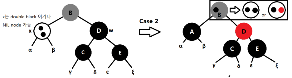 x의 extra-black을 p[x](B)에게 전달하고, w를 red로 바꾼다. p[x](B)를 새로운 x로 지정한다.