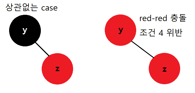 4) 문제가 된다! 새로 삽입한 z의 부모y가 black이면 상관이 없는데, red이면 조건 위반이다. 다음 그림처럼 말이다.