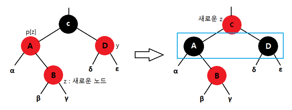 만약 case1에서 이 경우에 도착했다면 p[x]는 red였고, 따라서 새로운 x는 red&black이 되었다. 그냥 black으로 변경 후 끝.