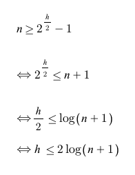 한 트리의 총 노드의 수 n은 바로 위에서 배운 x를 루트로 하는 subtree의 노드의 수(2^bh-1)보다는 크거나 같다.