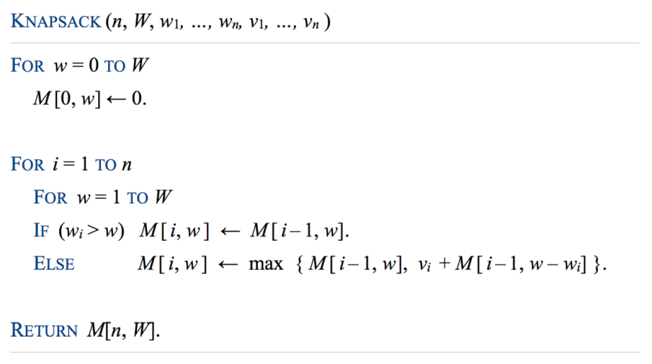 이를 sudo code로 구현하면 다음과 같다. (n은 아이템의 수 이고, W는 가방의 용량이다. v는 보석의 value이다.)