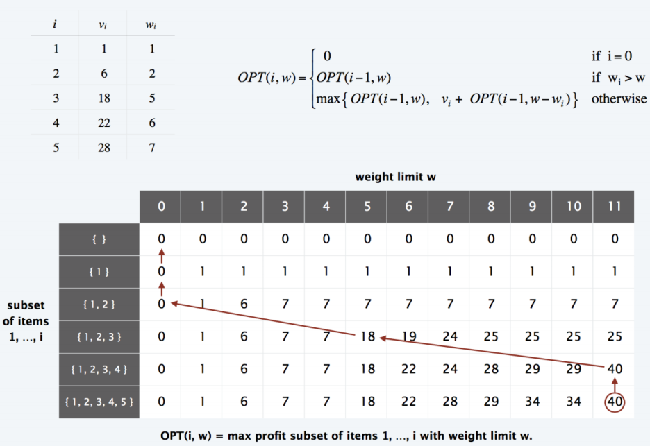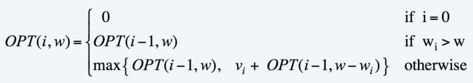 OPT(i, w) : 배낭 용량이 w일 때 아이템 1,2,...,i로 얻을 수 있는 최대 이득
