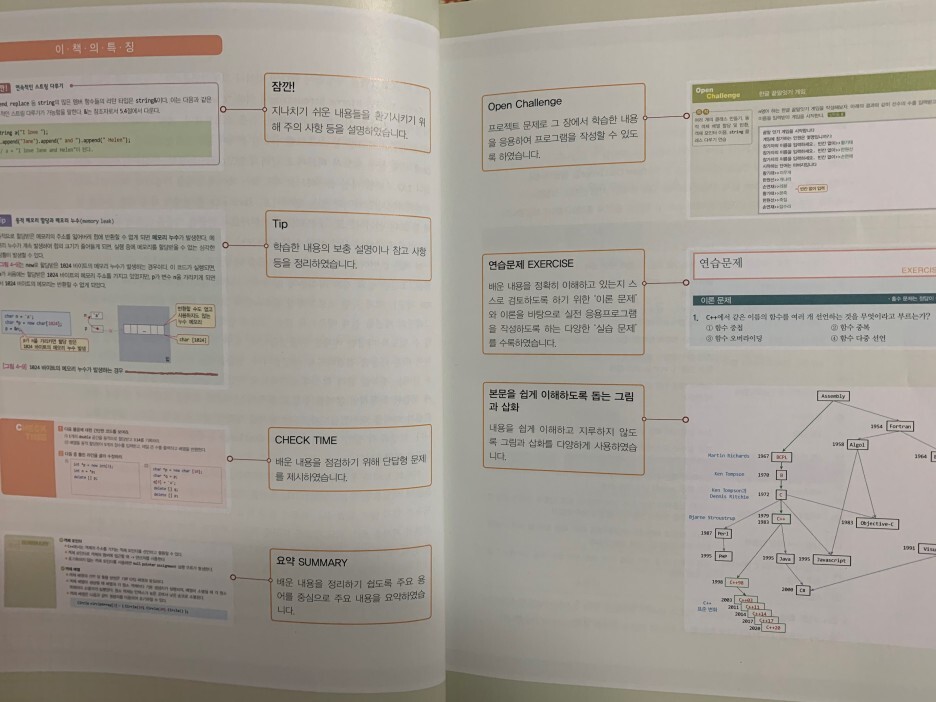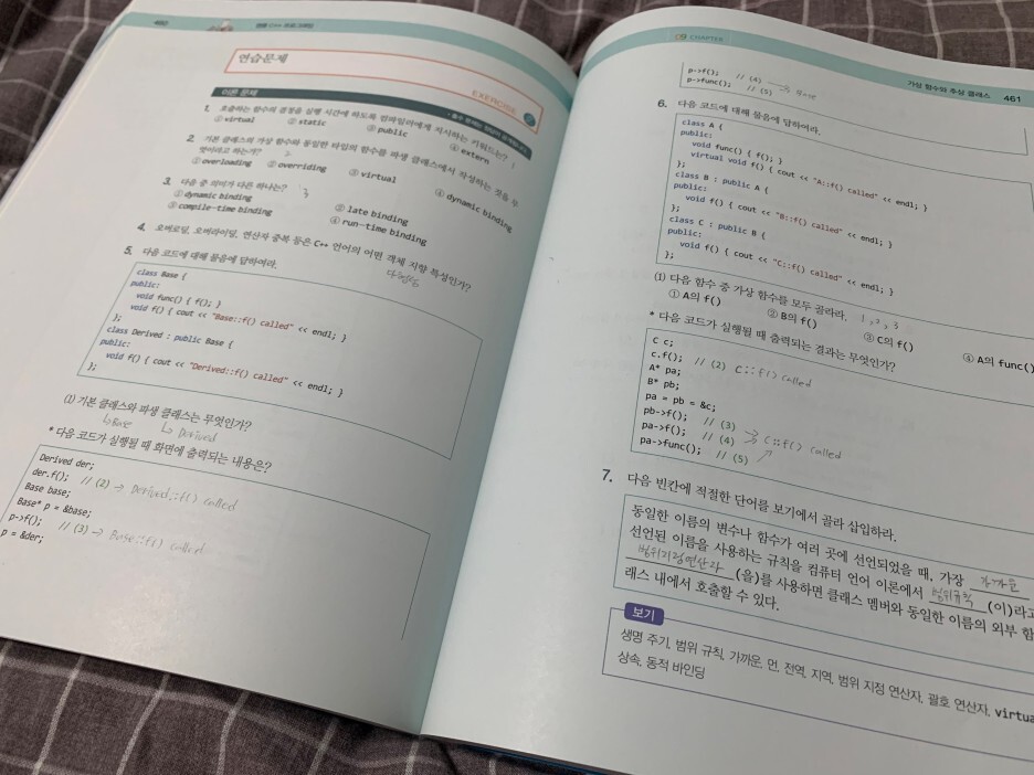 거의 기본적인 모든 C++의 문법을 다루는 책이기 때문에 개념완성하기 아주 좋다. 물론 심화적인 내용이 빠진 부분이 있겠지만 책이 600p정도로 평범한 점 을 생각하면 타당한 페이지수 인것 같다. 더 심도있는 공부야 다른책들을 더 읽어가면서 매꿔가야할 부분일 것이다.
