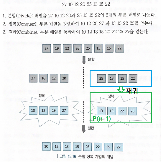 P(n-1)이 참이라 믿으면, 즉 n/2의 범위에서 MergeSort() 를 호출한후 sorting이 성공한다고 믿으면 (이는 위의 사진의 파란박스가 초록박스로 바뀌는 논리와 동일하다)