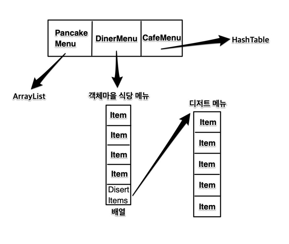 예를 들어 위의 그림을 보면 각 PancakeHouseMenu, DinerMenu, CafeMenu 안에 다른 item들이 있고, DinerMenu같은 경우 다른 메뉴인 디저트메뉴 까지 있는상황입니다.