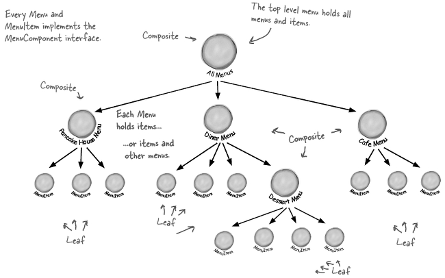 메뉴와 메뉴아이템을 똑같은 구조에 집어넣어 부분-전체 계층구조(part-whole hierarchy)를 생성할 수 있습니다.
