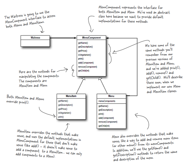 DinerMenu 안에 서브메뉴가 들어갈 수 있으면 좋겠지만... 형식이 다르기때문에 MenuItem으로 구성된 메뉴에 서브메뉴를 집어넣을 수가 없습니다. DinerMenu는 MenuItem 만 원소로 갖을 수 있는데, 서브메뉴는 MenuItems 이기 때문이죠...