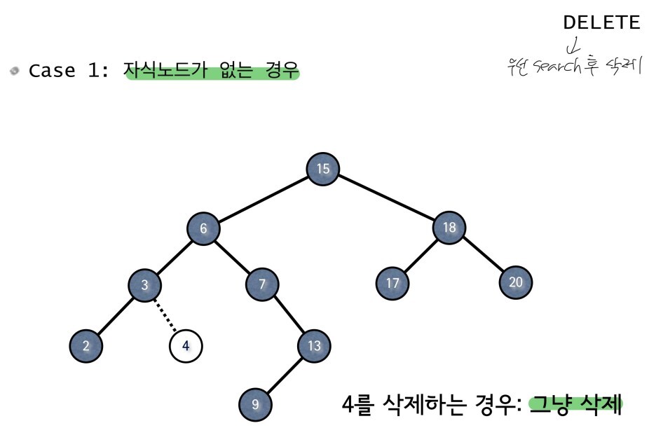 크게 Search, Insert, Delete 3가지 기능이 필요한데 Delete의 경우 삭제할 Node의 자식이 몇명인지에 따라 case가 나뉜다.