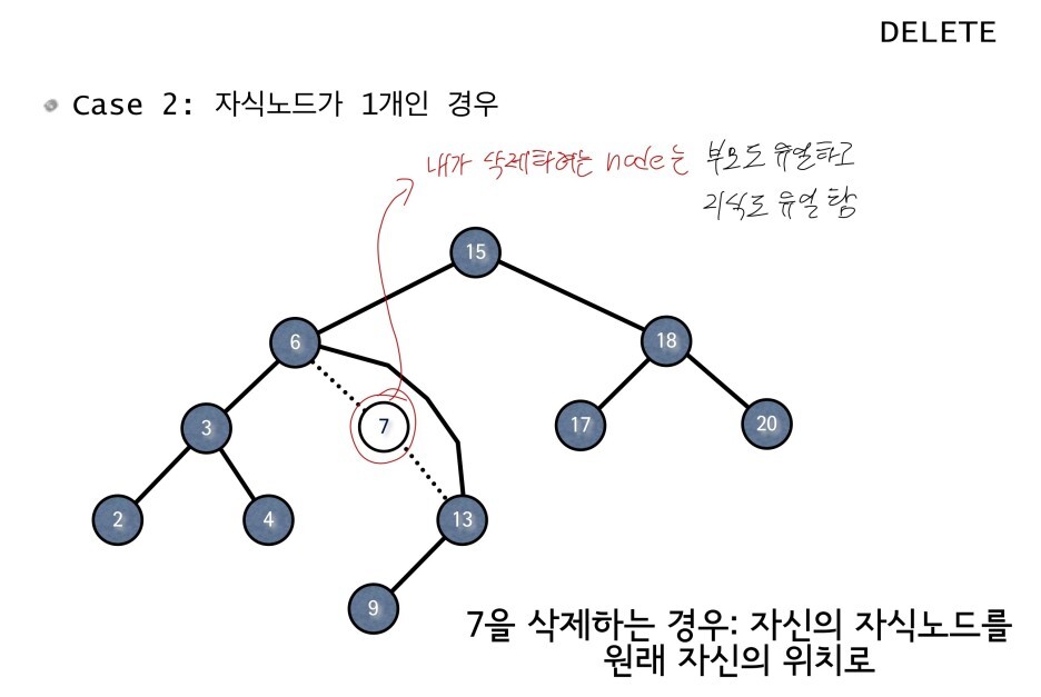 - case 2 : child가 하나 있는경우( 오른쪽 or 왼쪽 child )