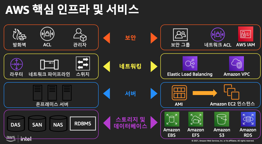 사진에서 왼쪽은 기존의 IT인프라의 모습을 볼수있다. 우측은 기존의 인프라를 AWS 클라우드에서 구현한 부분이다.