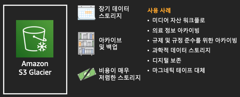 Glacier는 S3옵션중 선택할수 있는 여러 옵션중 하나로, 매우 저렴한 데이터 아카이브용 스토리지 서비스를 활용할수 있습니다.