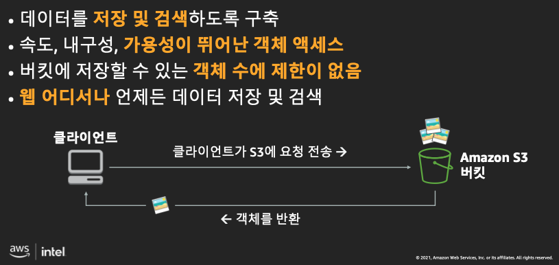 인터넷상 어디서나 원하는 양의 데이터를 저장하고 검색할수 있는 객체 스토리지가 Amazon S3이다.