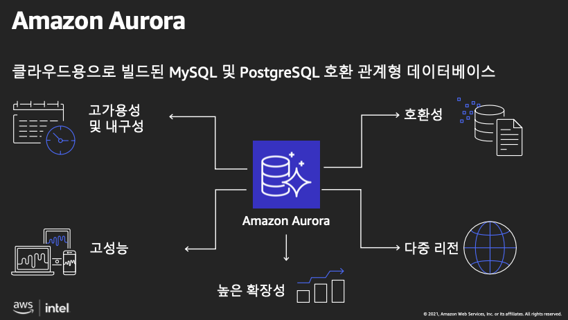 Aurora는 클라우드 위에 구축된 MySQL, PostgreSQL 호환 관계형 데이터베이스 입니다.