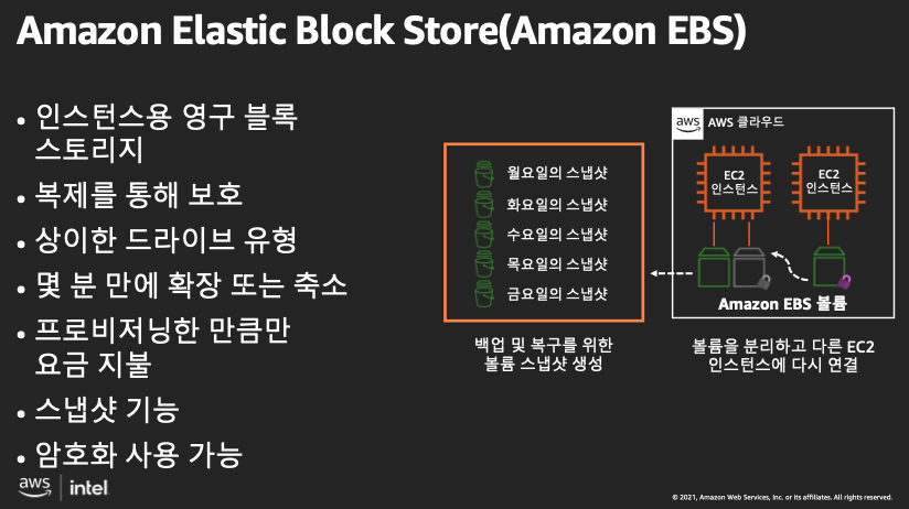 AmazonEBS는 EC2에서 사용하도록 설계된 고성능 블록 스토리지 입니다. 일반적으로 EC2 인스턴스에 대한 영구 저장소로 사용