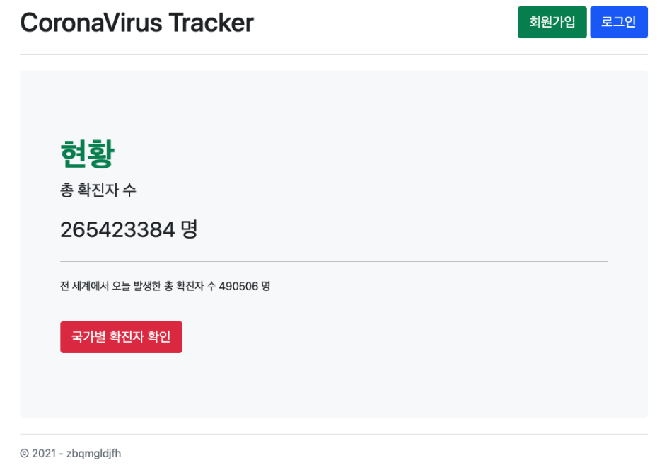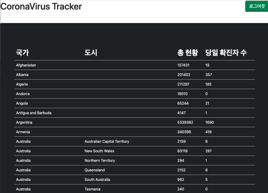 다음은 첫 홈페이지 화면과, 회원 가입한 사용자만 확인할 수 있는 국가별 현황이다.