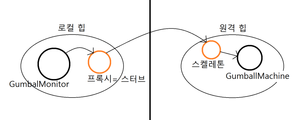 프록시가 진짜 객체를 대신하는 역할을 하는거죠. 실제로는 네트워크를 통해 GumballMachine 객체와 데이터를 주고받습니다