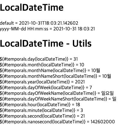 따라서 타임리프에서 자바8 날짜용 유틸리티는 #temporals 로 사용하면 된다. 다음 코드와 같이 말이다.