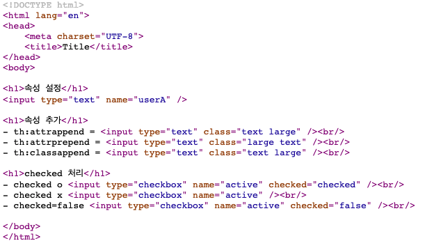 - th:classappend = <input type="text" class="text" th:classappend="large" /><br/>