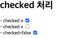 예를 들어 위와 같은 태그를 사용하면 checked="false" 임에도 불구하고 랜더링 하면 체크박스가 체크 되어 있다.