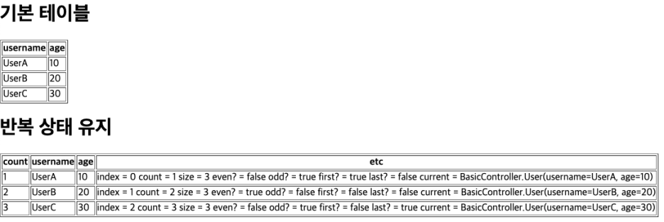 th:each는 단순 list 뿐만 아니라, java.util.Iterable , java.util.Enumeration 을 구현한 모든 객체를 반복에 사용할 수 있습니다.