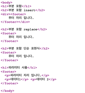 <div th:replace="~{template/fragment/footer :: copyParam ('데이터1', '데이터 2')}"></div>