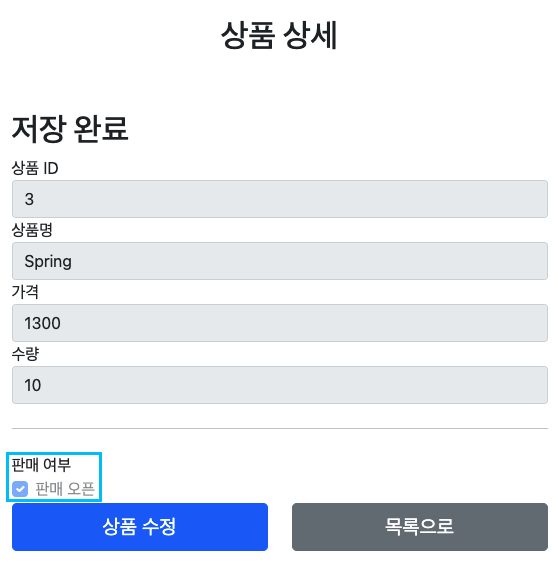 체크 박스에서 판매 여부를 선택해서 저장하면, 조회시에 checked 속성이 추가된 것을 확인할 수 있다.