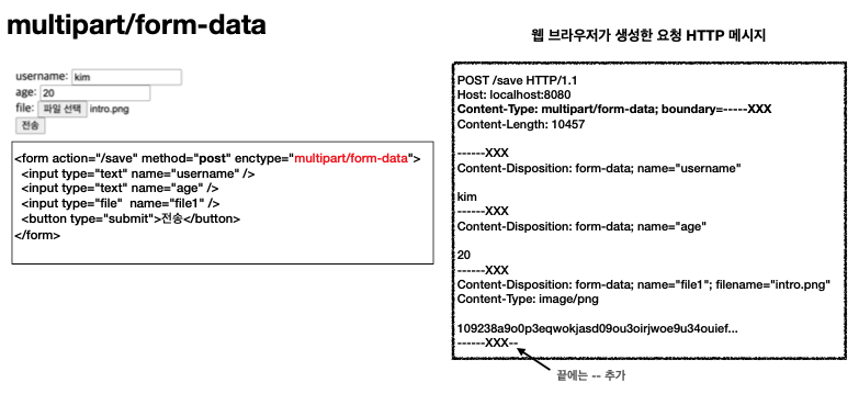 웹브라우저가 생성한 요청 HTTP 메시지를 보면 boundry = -----XXX를 기준으로 나눠서 데이터를 보내고 있다.