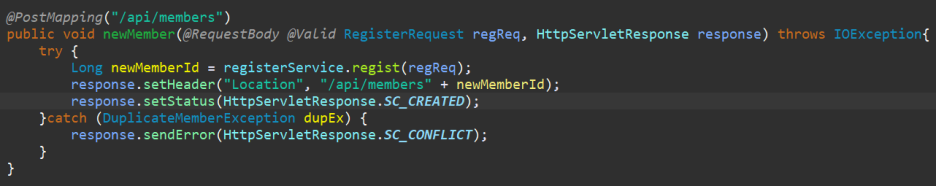 이 id를 response의 헤더에 setHeader() 메서드를 이용하여 "/api/members/4" 와 같은 형태로 등록하게 됩니다.