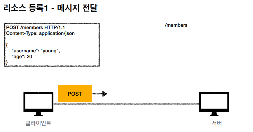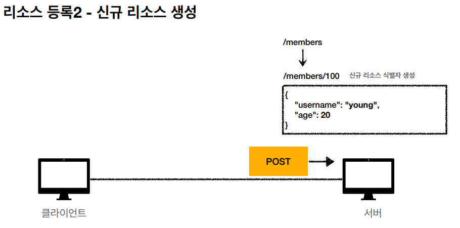 Client가 신규로 등록할 리소스에 대한 정보를 POST 방식을 통하여 /members 주소로 보내고 있다.