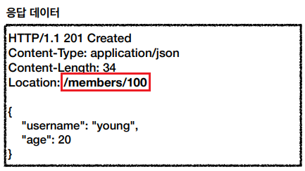 그림에 보이듯 /members/100 이라는 신규 리소스 URI를 서버가 정한 후, 클라이언트에게 통보한 것 이다.