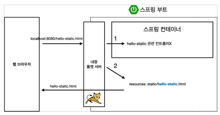 1) 우선 Client 측에서 /hello-static.html 라는 URI를 통해 요청하면, 톰캣이 이를 인지한다.