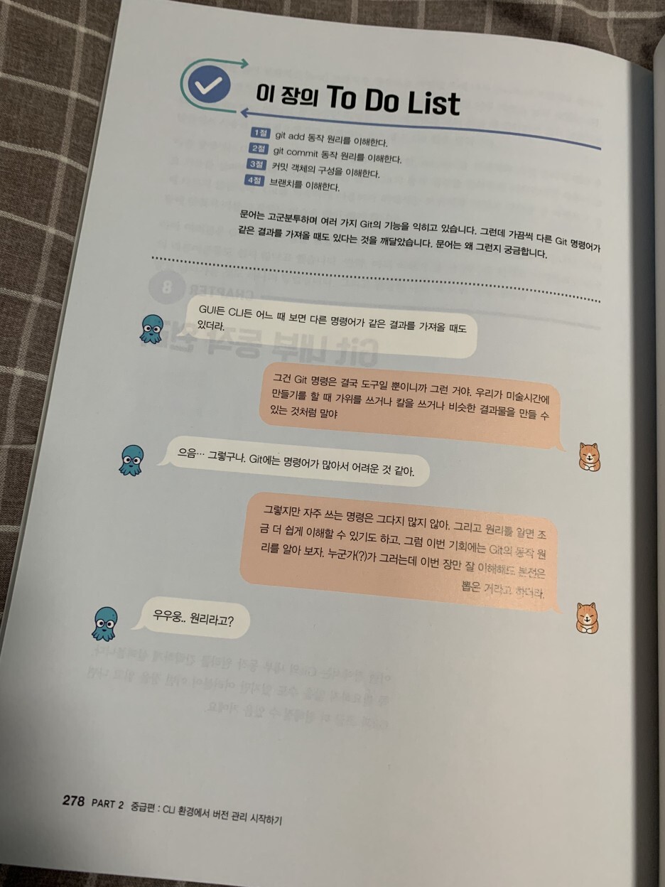 이 책의 도입부에는 항상 문어, 고양이 와 같은 친구들이 나와 해당 챕터에서 배울 내용에 대하여 알려준다.