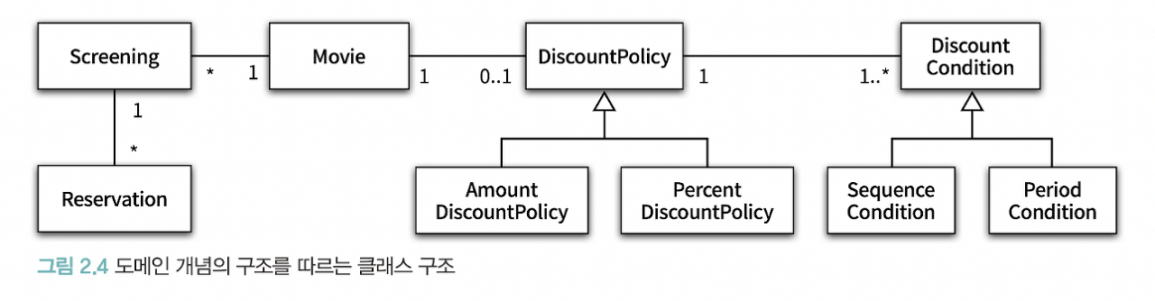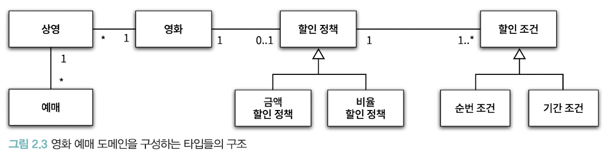 위 다이어 그램을 하나의 문장으로 정리하면 "영화 예매 요금은 최대 하나의 할인정책 과 다수의 할인조건을 이용해 계산할 수 있다"와 같다.