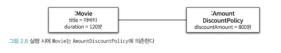 실행시에 Movie 인스턴스는 AmountDiscountPolicy 클래스의 인스턴스에 의존하게 될 것 이다.