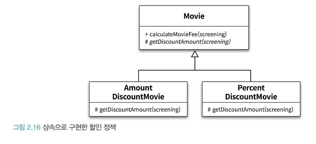 부모 클래스인 DiscountPolicy 안에 중복 코드를 두고, AmountPolicy, PercentDiscountPolicy가 이 클래스를 상속한다.