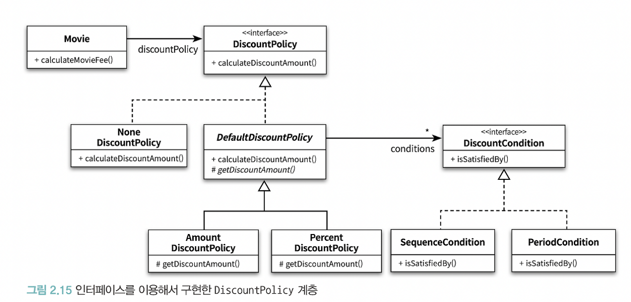 DiscountPolicy 역시 특정 할인 조건에 묶여있지 않다. DiscountCondition을 상속받은 어떤 클래스와도 협력이 가능하다.