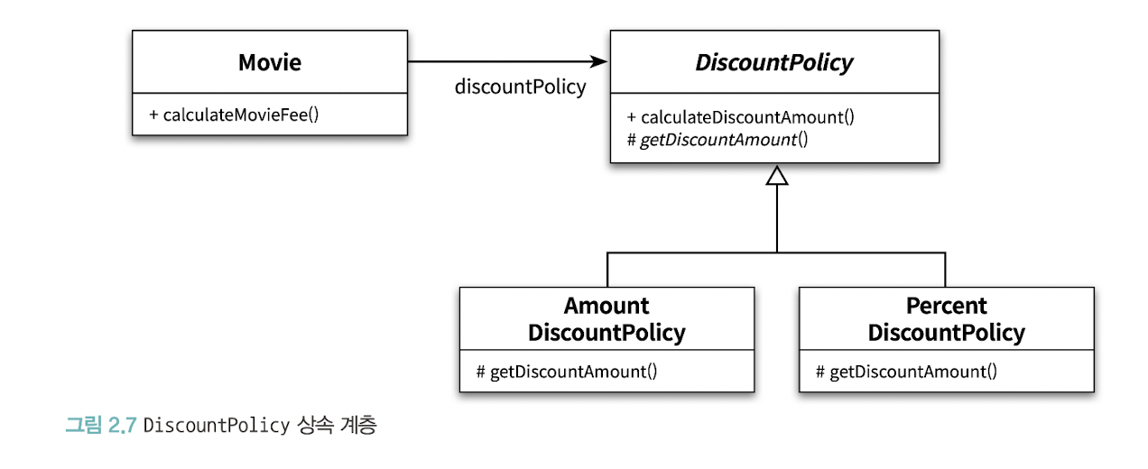Movie는 특정한 할인 정책에 묶이지 않는다. 할인 정책을 구현한 클래스가 DiscountPolicy를 상속받고 있다면 어떤 클래스와도 협력이 가능하다.