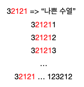 이미 32121 에서 2121 때문에 "나쁜 수열" 임이 판정났다. 뒤에 어떤 수를 더 추가해도 나쁜 수열이 된다.