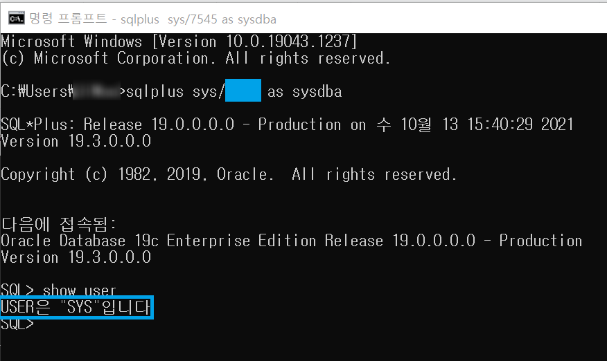 이후 show user 입력시 "SYS"가 되있으면 성공이다.