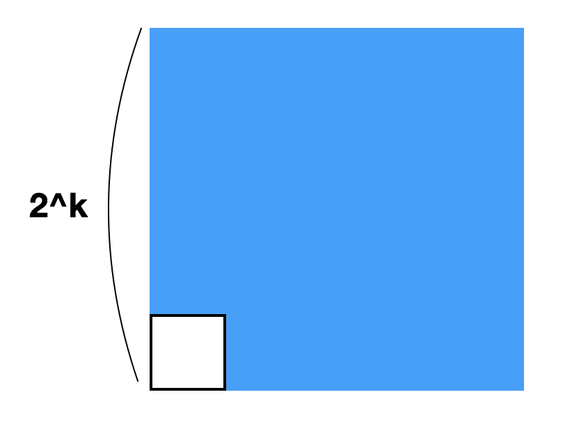 n = k일 때, 즉 정사각형의 한 변이 일 때, L-트로미노로 한 칸을 제외하고 모두 채울 수 있다고 가정하자.