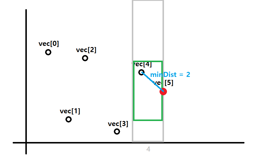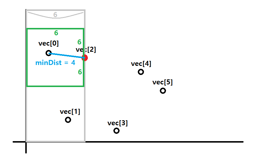 다음 점인 vec[4]에서도 마찬가지로 범위안에 다른 점이 존재하지 않아 minDist를 갱신하지 않는다.