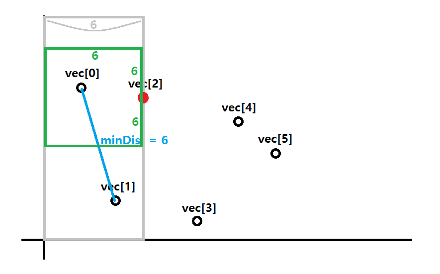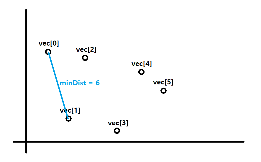 우선 vec[0]과 vec[1]사이의 거리가 1번 점까지 봤을때 가장 최소거리가 된다. 이를 minDist로 잡아둔다. 이 값을 6이라 해보자.