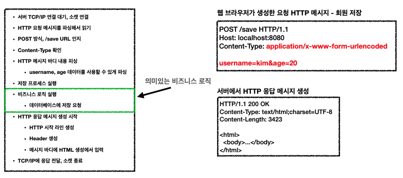 서블릿을 사용하게 되면, 딱 초록 박스 안의 비즈니스 로직 부분만 구현하면 된다.