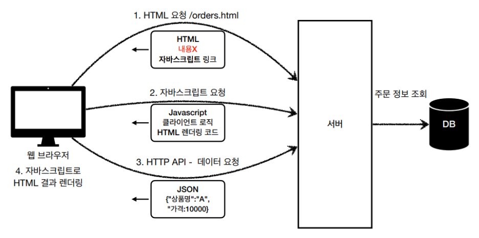 서버에서 JSP, 타임리프 등을 사용하여 HTML을 생성해서 클라이언트에게 전달한다.