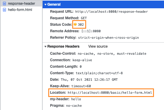 "/response-header" 로 접속하면 sendRedirect()메서드를 통하여 "hello-form.html"로 이동하게 된다.