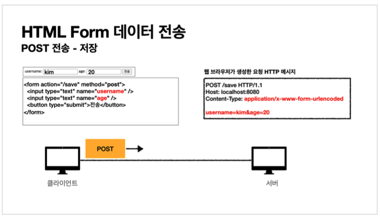 - POST HTML Form 형식으로 데이터를 전달하면 HTTP 메시지 바디에 해당 데이터를 포함해서 보내기 때문에 바디에 포함된 데이터가 어떤 형식인지 content-type을 꼭 지정해야 한다. 이렇게 폼으로 데이터를 전송하는 형식을 application/x-www-form-urlencoded 라 한다.