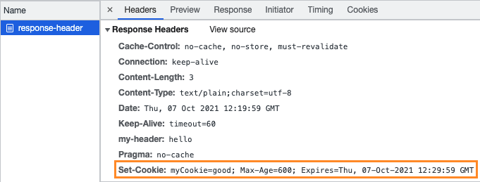 // Set-Cookie: myCookie=good; Max-Age=600;